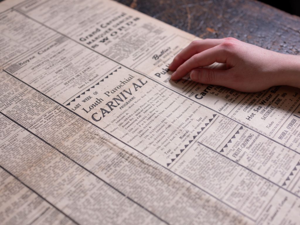 One example of this can be found in a copy of The Argus, Meath Herald and Leinster Journal from June 10th, 1950. On the back page, alongside cinema screenings and other advertisements, an entry announces the last week of the Louth Parochial Carnival. While the location is not mentioned, it likely took place in Blackrock, due to its popularity as a seaside destination. Listed below the heading is the schedule for the week, with details for each night’s entertainment act.